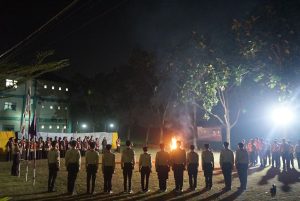 Acara berlanjut dengan api unggun, simbol semangat, kebersamaan, dan rasa persaudaraan. Di sekitar api, peserta saling menyemangati dan menunjukkan kekompakan regu masing-masing.